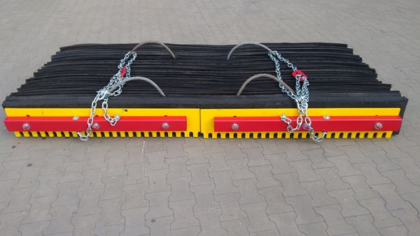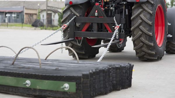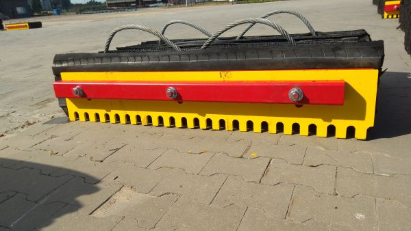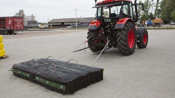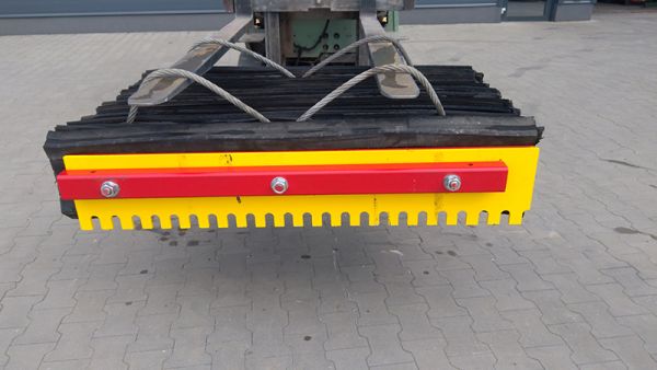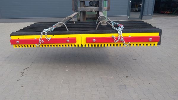 Road scraper is manufactured from the strips of truck tires and solid steel frame. All metal parts used in the construction are made of high quality steel which determines its durability. The road scraper is equipped with wear resistant front teeth plates of Hardox type with adjustable height. Hardox system allows the machine first to loosen the ground before equalization and is also adopted to road profiling what clearly improves water drainage from the road.